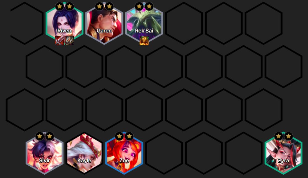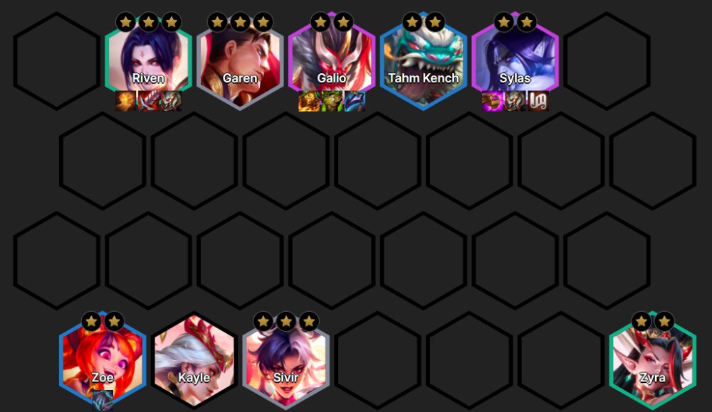 Garen, Sivir, Riven, Zyra, Tahm Kench, Zoe, Galio, Sylas.