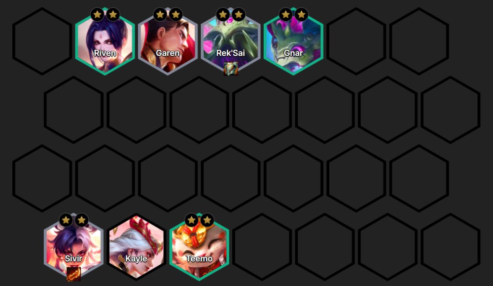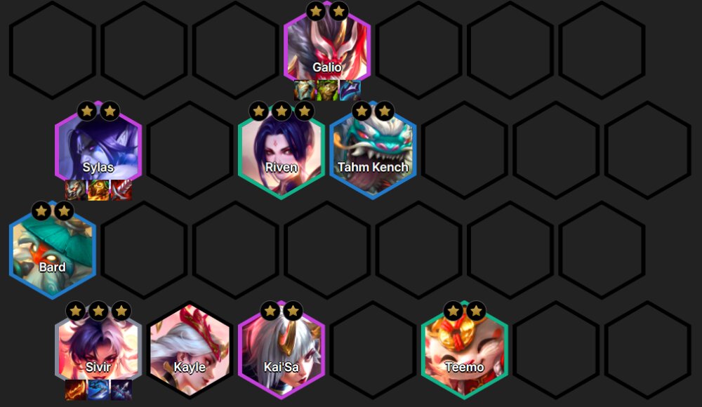 Sivir, Riven, Teemo, Bard, Tamh Kench, Kai'Sa, Galio, Sylas.