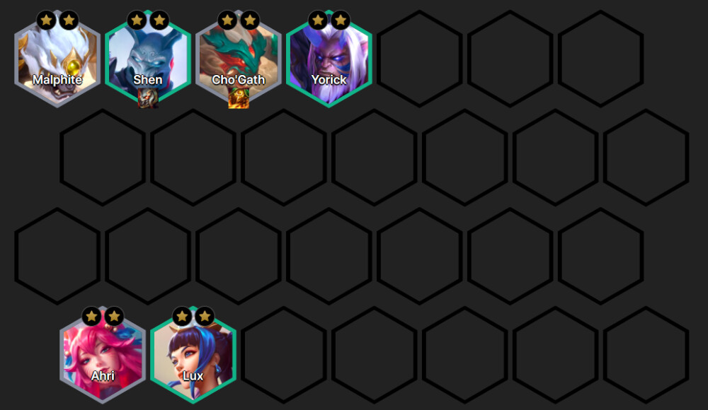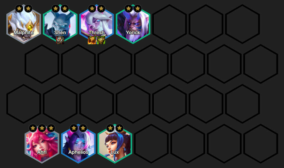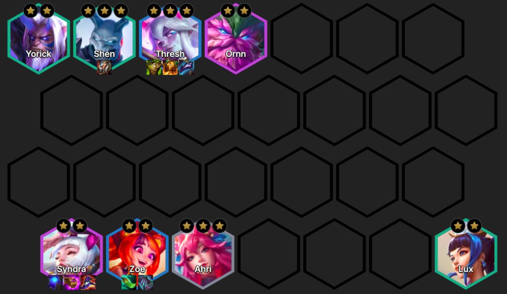 Ahri, Lux, Yorick, Shen, Zoe, Thresh, Ornn, Syndra.