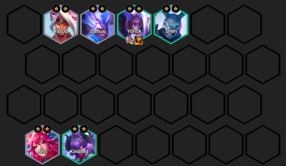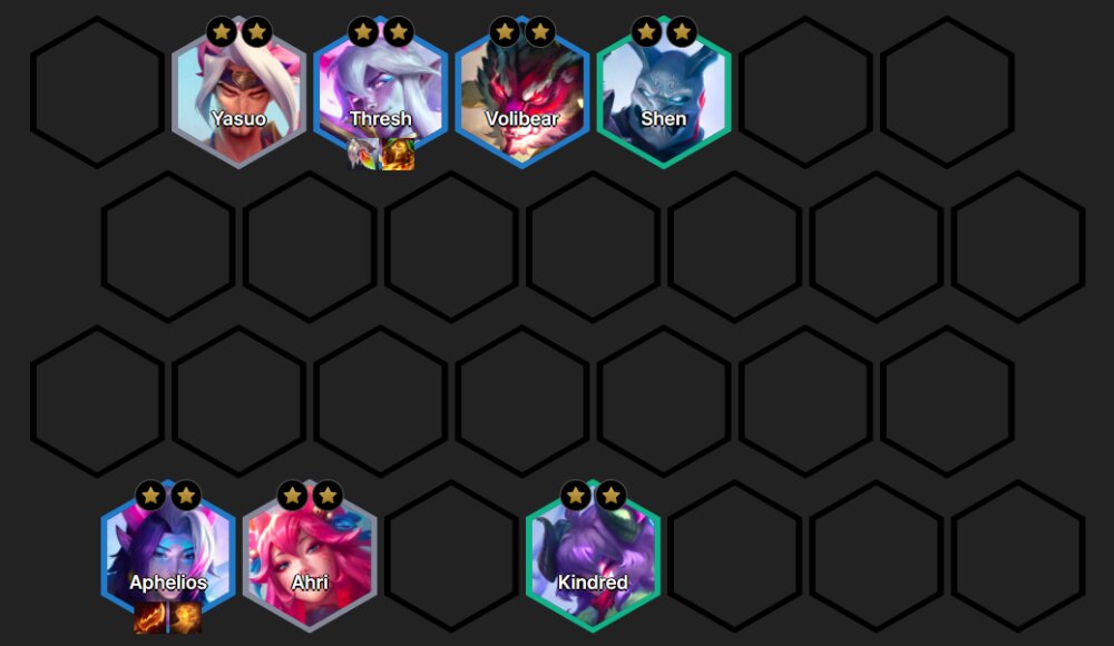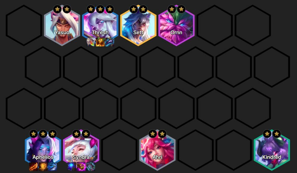 Ahri, Yasuo, Kindred, Aphelios, Thresh, Ornn, Syndra, Sett.