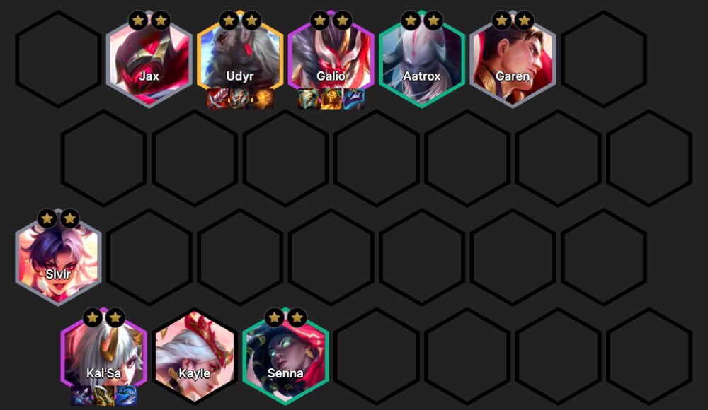 Jax, Garen, Sivir, Aatrox, Senna, Kai'Sa, Galio, Udyr.