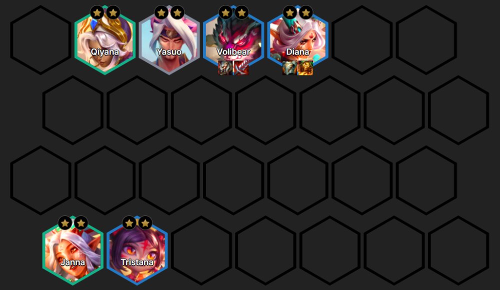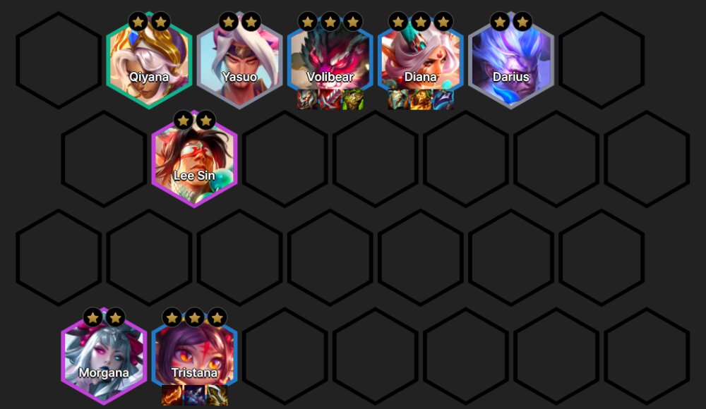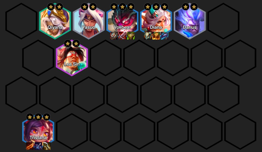 Darius, Yasuo, Qiyana, Diana, Tristana, Volibear, Lee Sin, Morgana.
