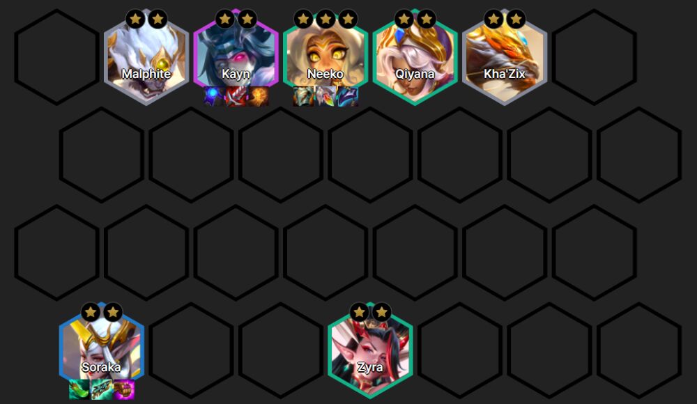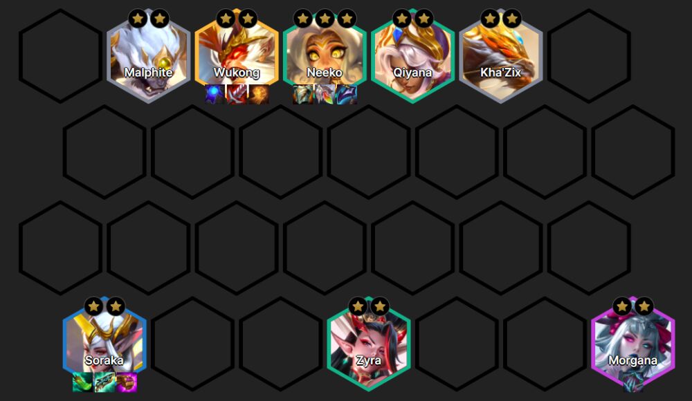 Kha'Zix, Malphite, Neeko, Zyra, Qiyana, Soraka, Morgana, Wukong.