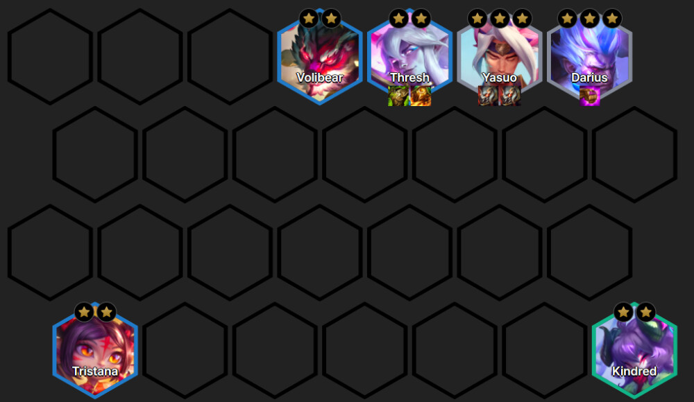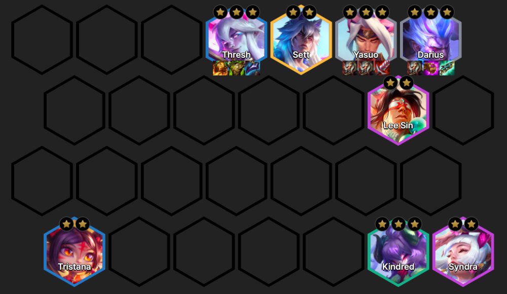 Yasuo, Darius, Kindred, Tristana, Thresh, LeeSin, Syndra, Sett.