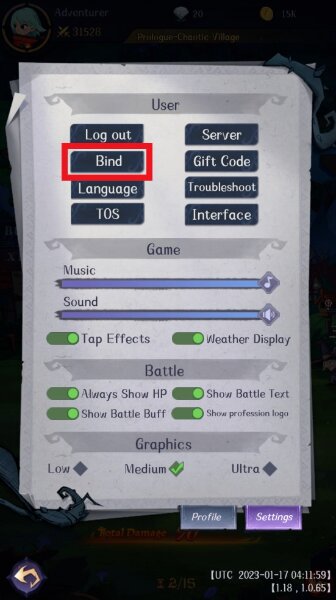 First, make sure you have an account in a third-party app. Then you need to enter the game, select the section Profile in the top left corner. There you choose the section Setting then touch Bind. Bind in this Madtale game has 3 options, that is account archosaur, Facebook , and Google.