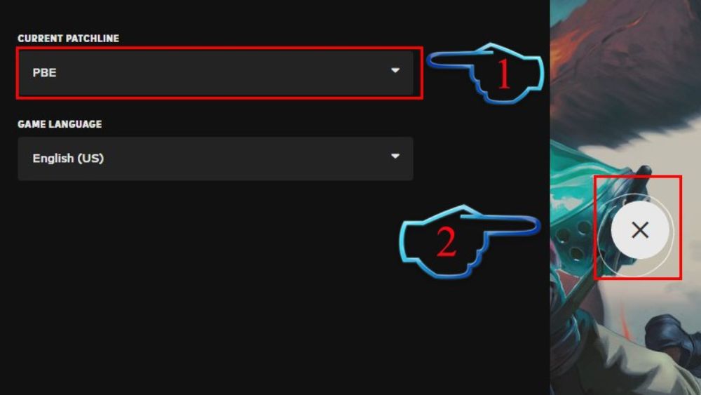 choose PBE at CURRENT PATCHLINE , and English at GAME LANGUAGE then save at icon "X".