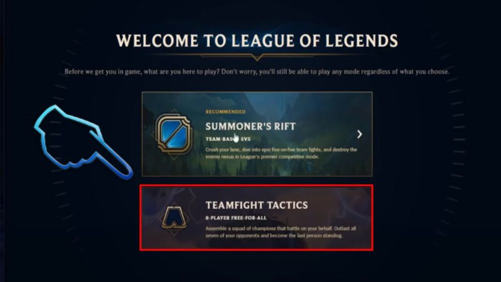 Step 5: A welcome panel will appear, select TEAMFIGHT TACTICS. After completing this step, you have successfully created the character, turn off the game and perform the following steps.