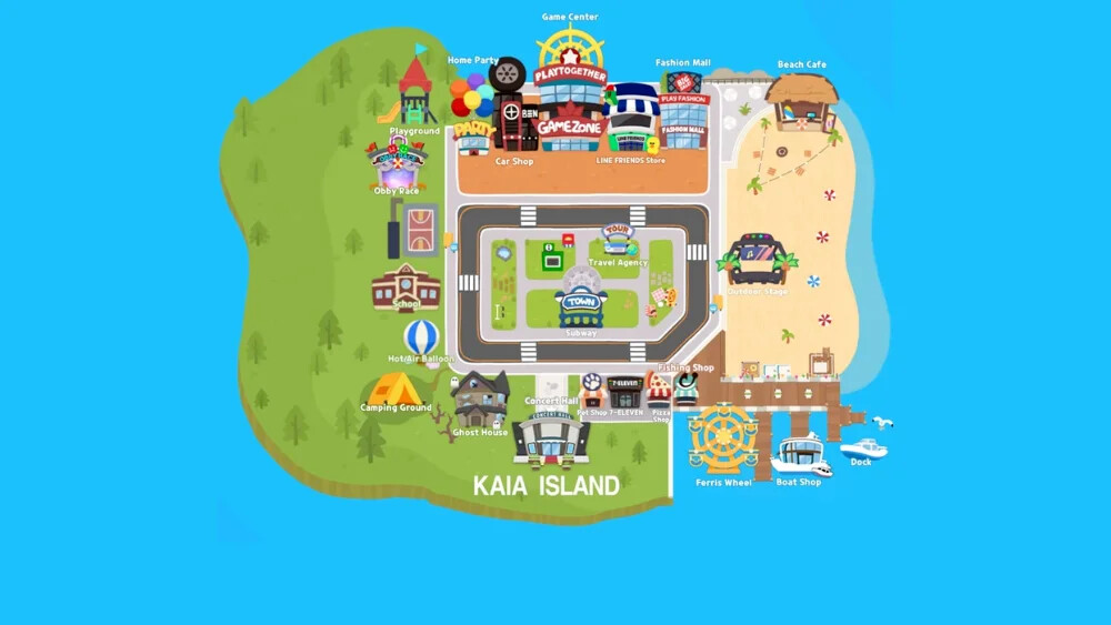 Kaia Island is the world in the game Play Together, where players from all over the world get together, play minigames, go shopping and more. Kaia Island consists of 4 main areas: The Plaza, Down Town, Campground and Home Town.