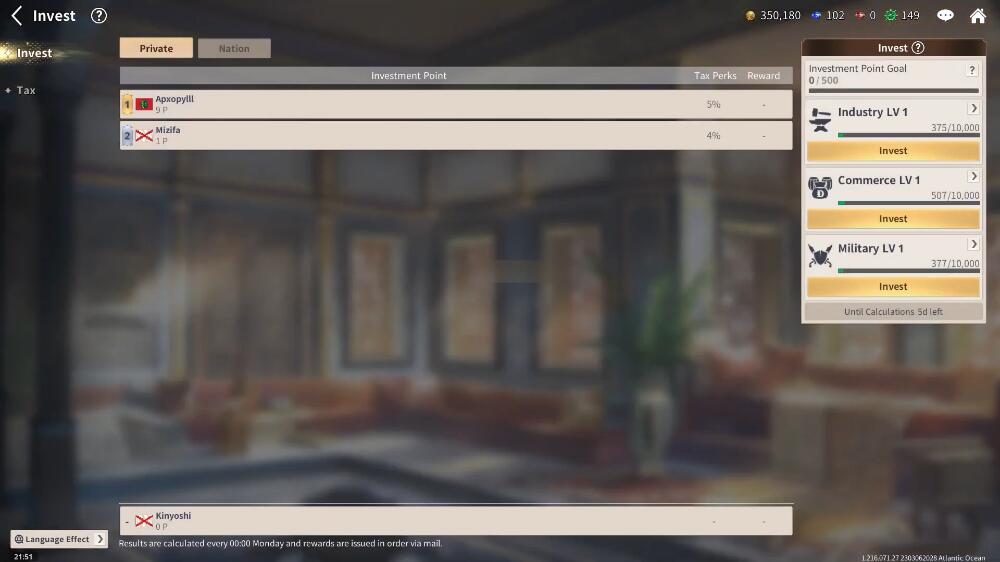 Content that allows you to cooperate and compete with the top players a server. Each city can be invested and each country competes for the amount.