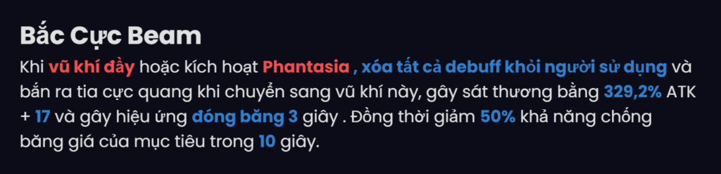 | 6 ★ | Within 10 seconds after switching to weapon, increase 60% Damage of normal and debilitating attacks. Cooldown time: 25 second. |