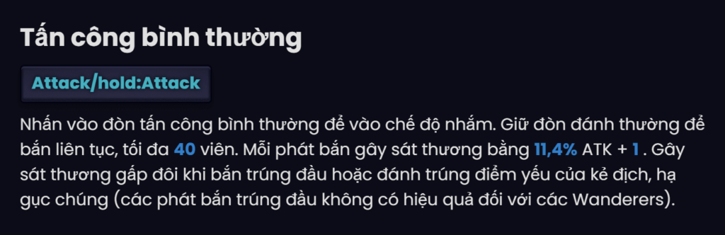 | 3 ★ | Within 10 seconds after switching to weapon, increase 30% Damage of normal and weak attacks. Cooldown time: 25 second. Increase ammo 80. |