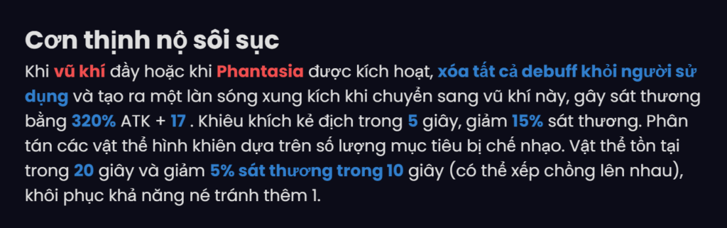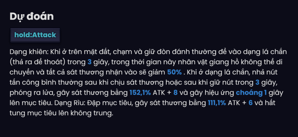 | 5 ★ | After switching to shield ax, immediately Giam 30% Damage, reduce 10% after each 3 seconds, down to the minimum 10%. Switching weapons will cancel this effect. Cooldown time: 30 second. |