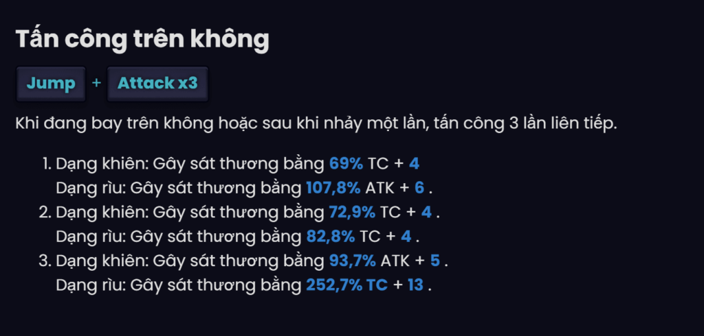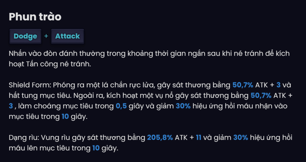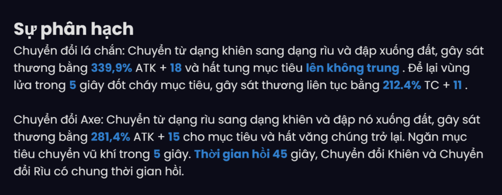 | 1 ★ | Using the Dodge skill or branch skill while in shield form creates a strong stack of Shields, Giam 10% Damage in 15 seconds and max stacks 3 time. Switching to ax form will convert all stacks of Strong Shield to Sharp Ax stacks, each stack will increase 15% Damage caused in 15 second. Switching to a different weapon will cancel this effect. |
