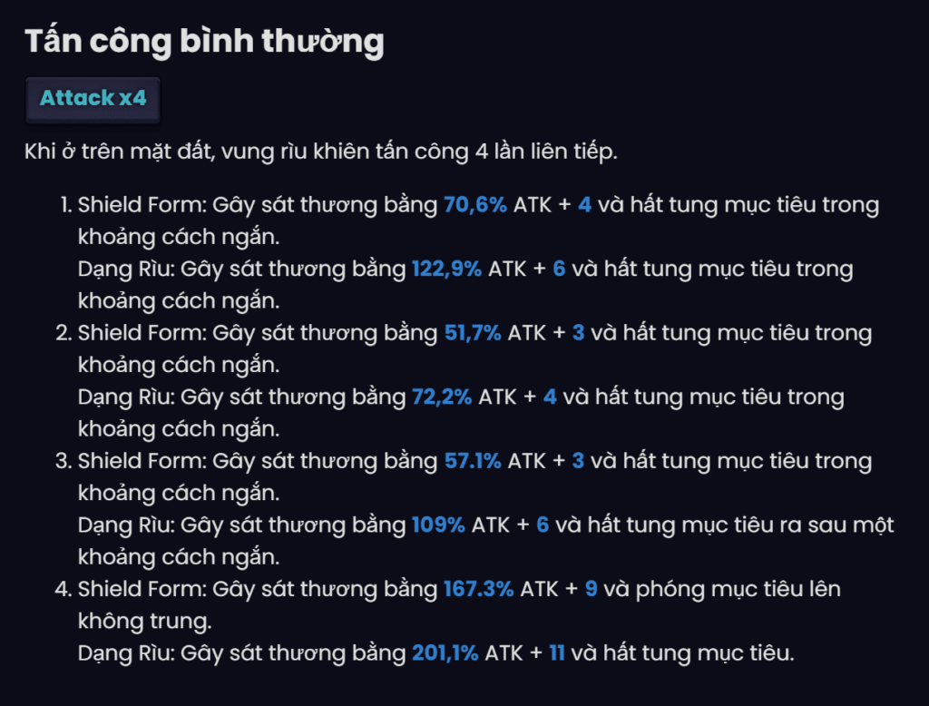 | 3 ★ | While in shield form, branch/dodge attacks deal bonus damage to the target equal 4% HP current user. |