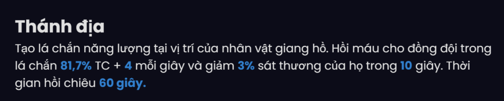 | 6 ★ | To all allies within range of the skill Giam 60% damage and immunity with crowd control effects. |
