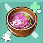 |  Beet Soup ★ ☆☆ | • Beetroot x2 | Reproduce 7 Feeling of fullness. Use it to instantly restore (12% + 3.300) HP to Humanity. |