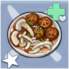 |  Fried Mushrooms ★ ☆☆ | • Mushroom x2 | Reproduce 5 Feeling of fullness. Use it to instantly restore (10% + 1.500) HP to Humanity. |