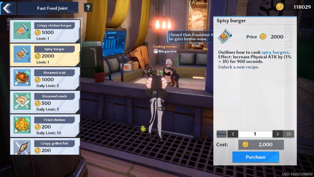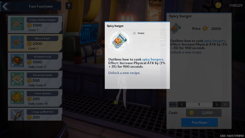 |  Spicy Burger ★ ☆☆ | • Homi Grain x3 • Rear Hock x2 • Lettuce x1 | Reproduces 10 feelings of satiety. Increases Physical Attack by 1%, Physical Attack +45 for 900 seconds. |