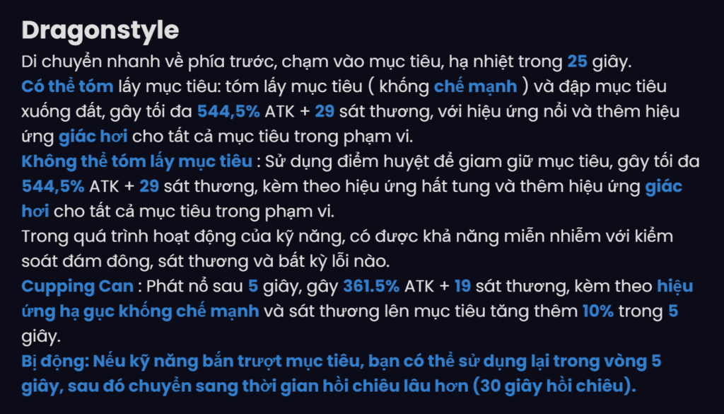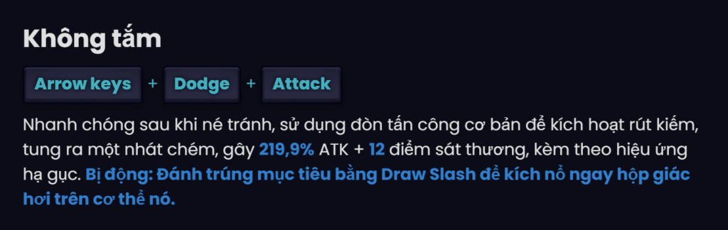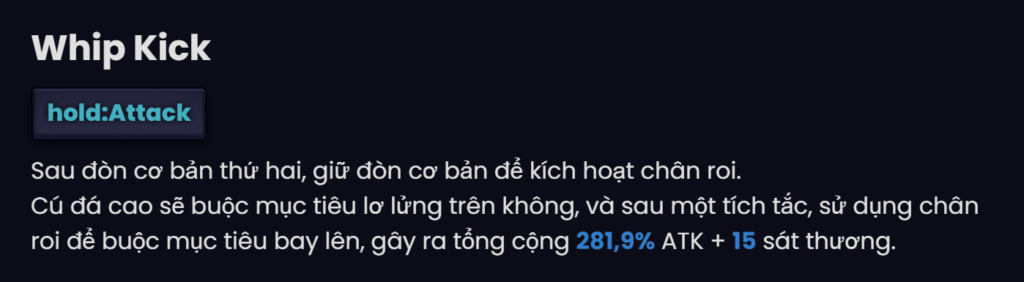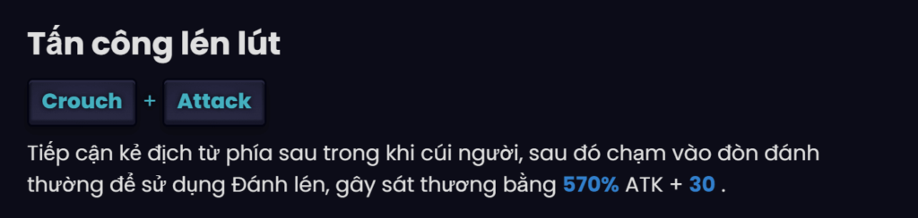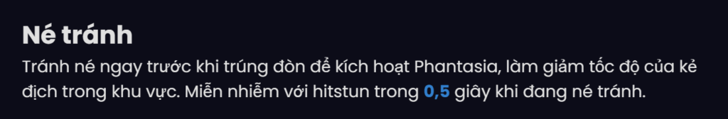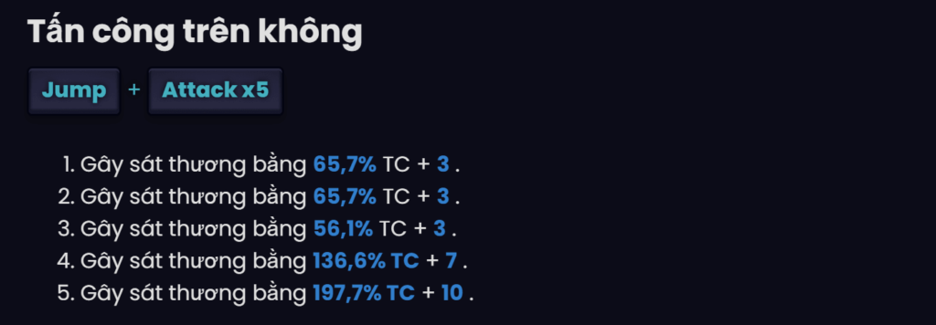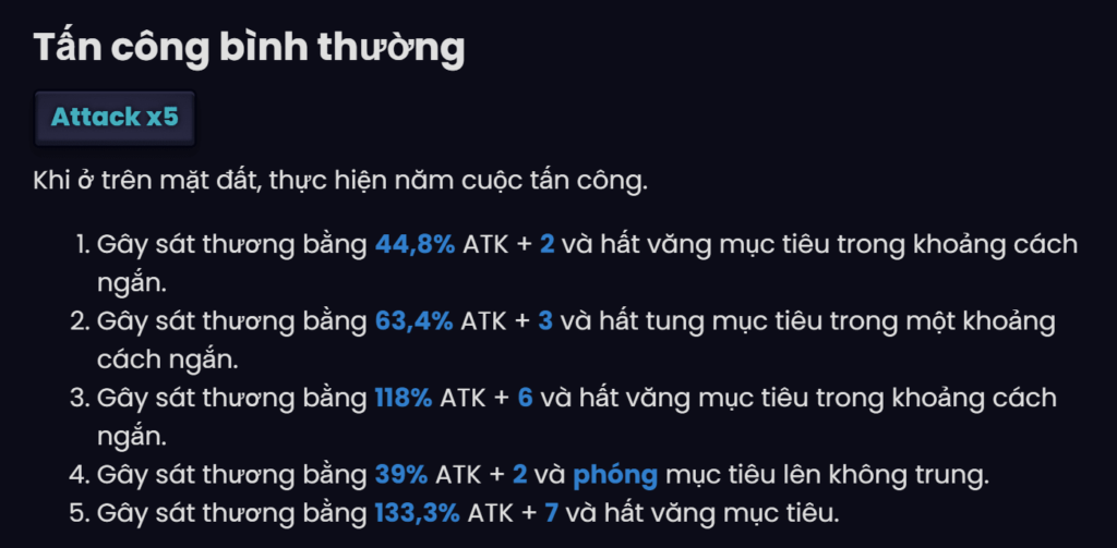 | 5 ★ | When attacked, automatically activate a block 1 seconds (immediately disabling crowd control), one hit block up to 20% Max HP your. Performing a basic attack during the block time will start a counterattack , cause 240% ATK and launch to the target in the air, cooldown is 18 second. |
