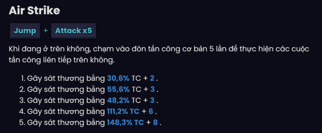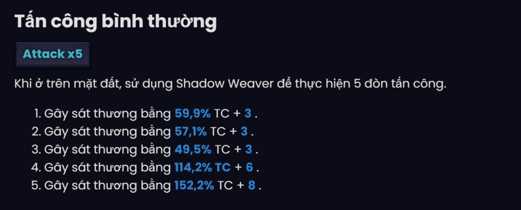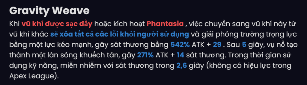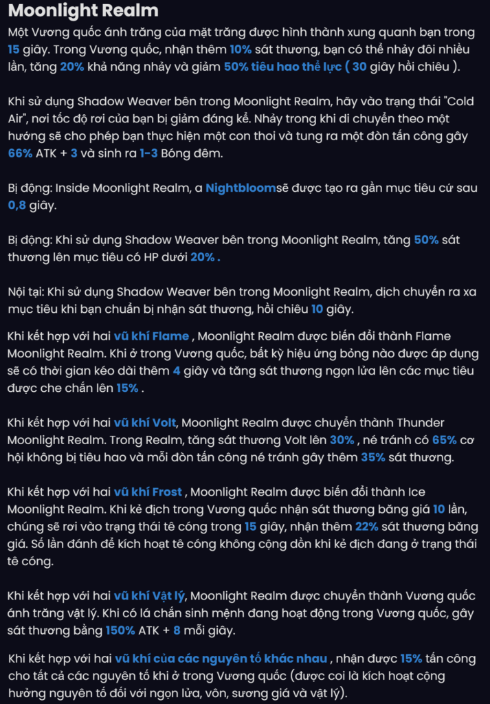 | 5 ★ | While inside Moonlight Realm, take 30 weapon points per second and increases the damage of sparking skills by 15% . |
