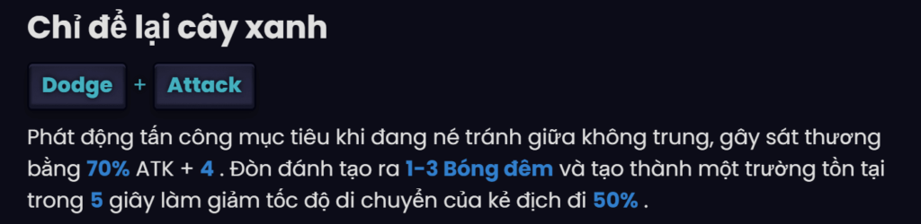| 1 ★ | Basic attacks deal AoE damage. When Nightblooms are within range of each other's explosions, Increases the damage of subsequent explosions by 10% each time (up to 50% ). Moonlight Realm Nightblooms spawn time reduced 0,5 second. |