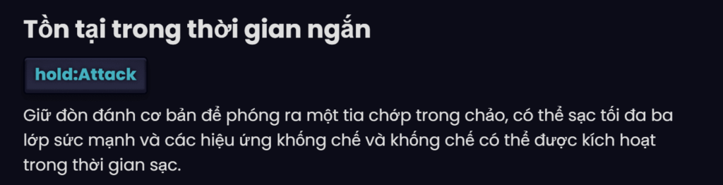 When the weapon is fully charged, the next attack will leave a mark on the enemy and explode later 5 second. The explosion caused 25% Damage caused during tick time, max 560% ATC. Only one mark can exist at a time.