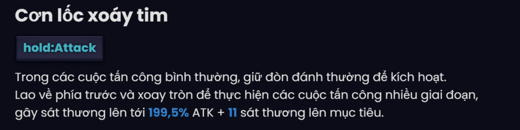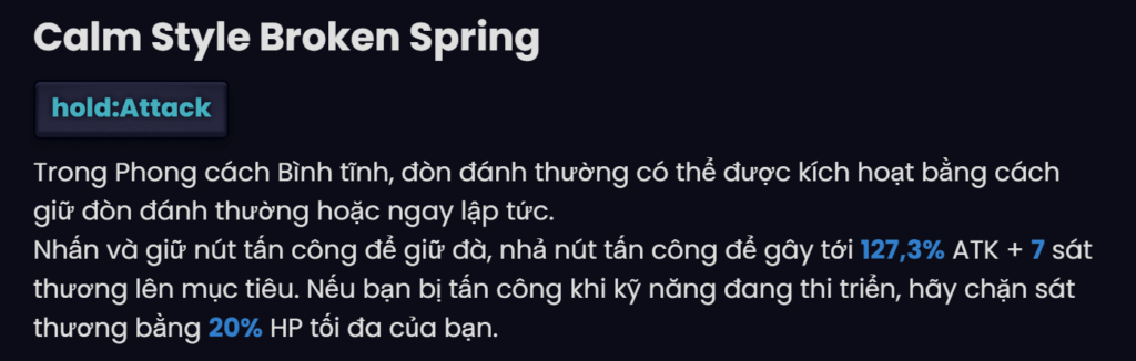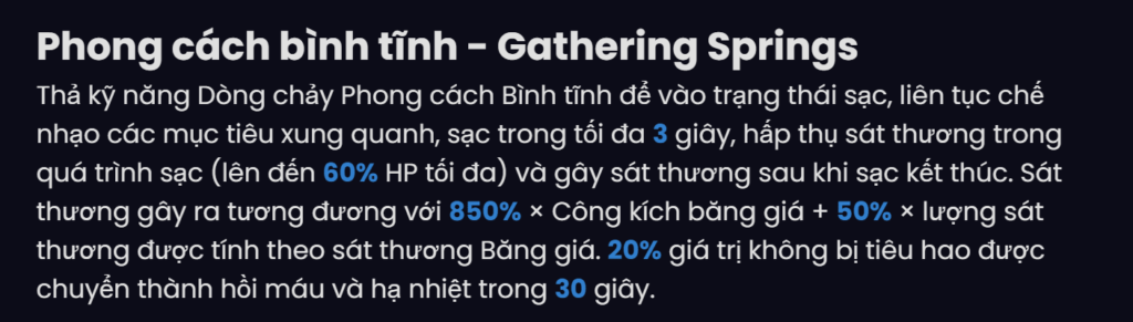 | 4000 | When the blood is below 70%, nhận 40% resistant to all elements and more 60% Frost resistance. When blocked with Silent Flow [Surge], grants 3 blocks to the ally with the lowest health (except yourself) for 10 second. The amount of blocks will not exceed 15% ally's maximum health. |