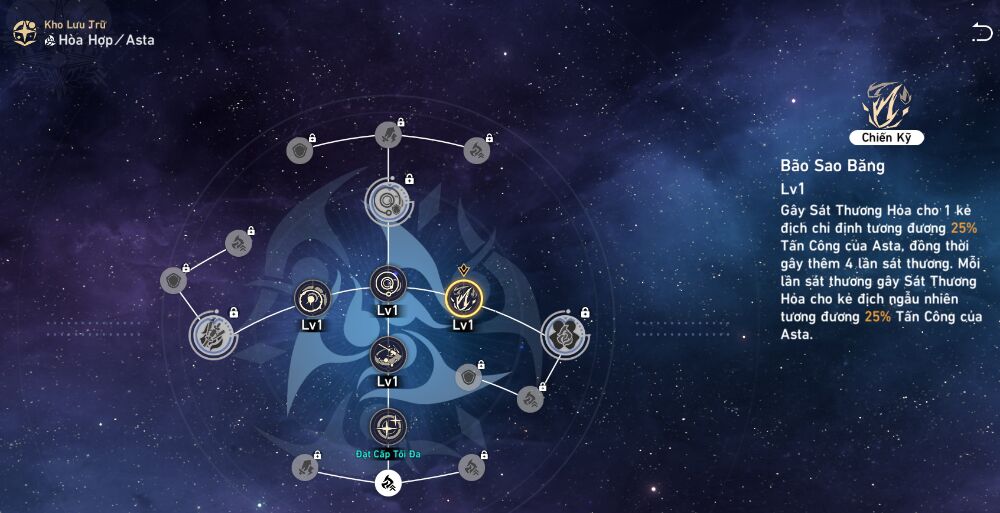 Chiến kỹ “Bão sao băng” của Asta gây sát thương Hỏa cho một kẻ thù duy nhất và phản chiếu lên 4 kẻ thù ngẫu nhiên. Đối với mục tiêu đơn, kỹ năng này sẽ tấn công năm lần, làm cho nó trở thành một công cụ hiệu quả để phá vỡ kẻ địch.