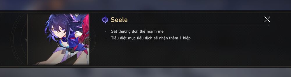 | 1 | Đánh bại kẻ thù bằng đòn Tấn công thường hoặc chiến kỹ. Sau đó kích hoạt Tuyệt Kỹ của Seele trước khi lượt đánh kết thúc. |