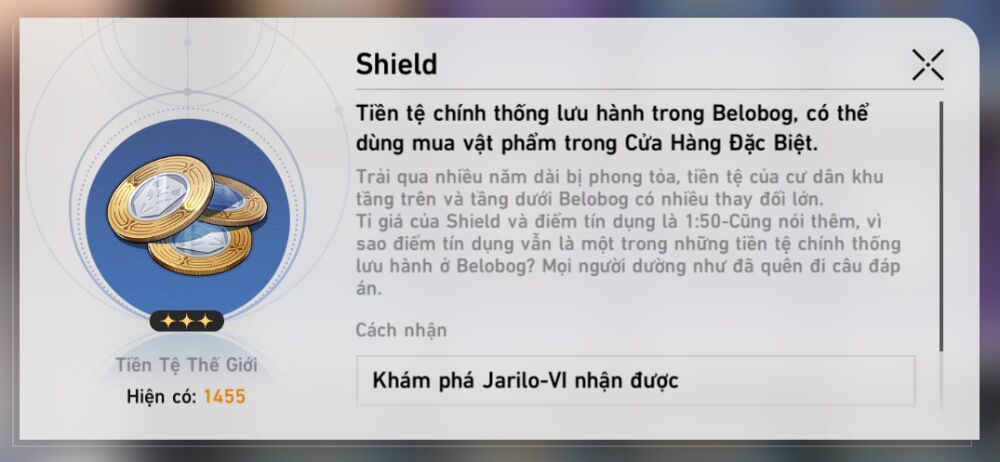 Shield chỉ có thể được sử dụng trong cửa hàng thế giới của Jarilo-VI. Bạn có thể sở hữu Shield bằng cách thực hiện các nhiệm vụ phiêu lưu của Jarilo-VI và được tìm thấy bên trong các rương nằm rải rác khắp thế giới đó.