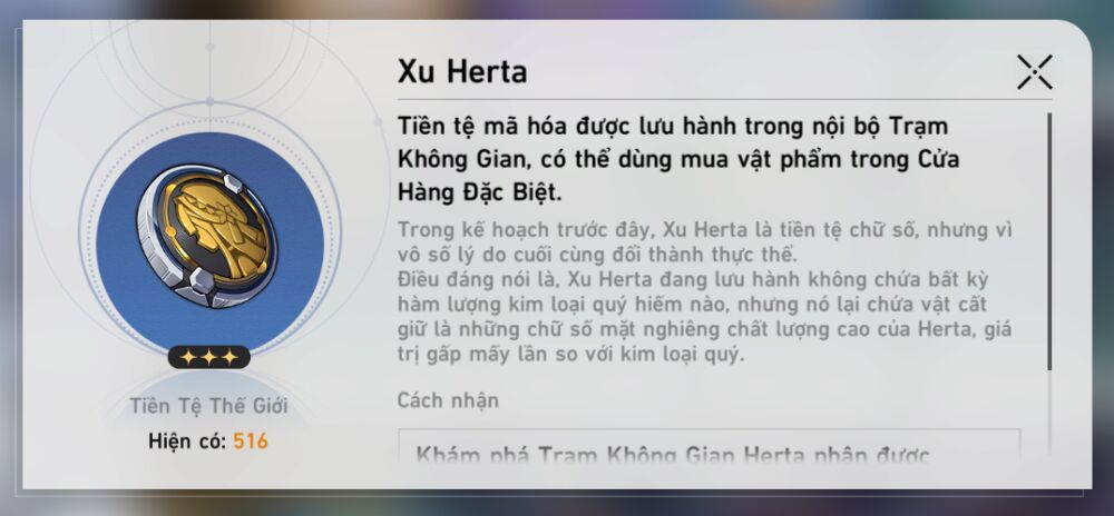 Xu Herta chỉ dành riêng cho cửa hàng thế giới của Trạm không gian Herta. Bạn có thể nhận được Xu Herta như một phần thưởng khi hoàn thành các nhiệm vụ phiêu lưu trong khu vực thế giới của trạm không gian Herta và mở các rương xung quanh nhà ga.