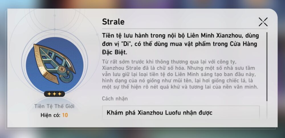 Strales có thể được sử dụng trong cửa hàng thế giới của Xianzhou Luofu và có được bằng cách hoàn thành các nhiệm vụ phiêu lưu trong Xianzhou Luofu. Nó cũng có thể được tìm thấy bên trong những chiếc rương rải rác xung quanh con tàu.