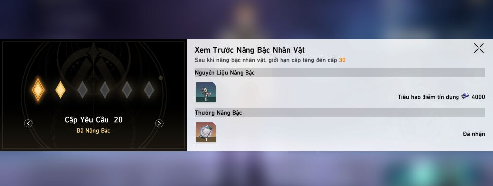 Đối với lần nâng bậc thứ 1, 3 và 5 của mỗi nhân vật, bạn sẽ nhận được một Vé Tinh Cầu miễn phí mà bạn có thể sử dụng để quay Banner nhân vật.